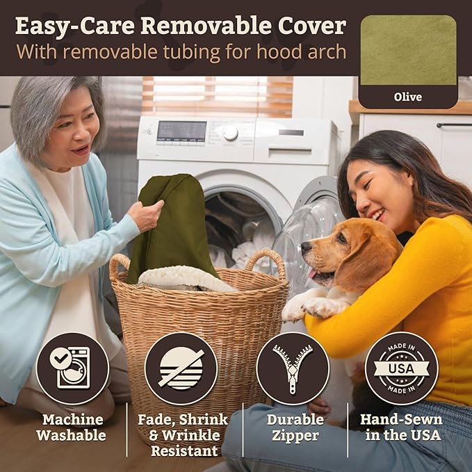 - DURABLE, LUXURY FABRIC. With a microsuede cover, this bed is luxuriously soft to the touch and holds up to heavy use and regular cleaning while still looking great. Our strong and durable microsuede cover stands up to daily wear-and-tear from even the most enthusiastic pups, and is stain-resistant, water-repellant, and machine washable. To clean, just remove the plastic rod from the hood and unzip the easy-off cover to wash cold, then hang dry. This high-quality dog bed will hold up for years!
