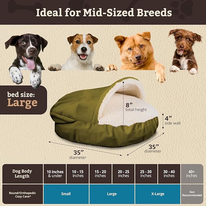 - SIZING: This Large Cozy Cave has a 35” diameter, a 4” sidewall, and an approximate 8” hood opening. A thin removable plastic tube keeps the hood open for easy entry or exit and can be removed through the small hole at the corner of the hood. This size Large provides space for mid-sized breeds while creating a snug, enveloping feel. Please scroll down and check our size chart below for our best recommendations based on breed to ensure you buy the right size for your pup.