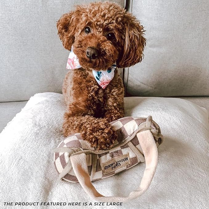 - Funny Parody Plush Dog Toy: Let your furry fashionista fetch or strut some fashion-forward fun with this Checker Chewy Vuiton Handbag that features a stylish taupe and cream checker pattern with an inner squeaker hidden inside. It’s a playful, cute interactive dog toy that combines style & fun. Size Large 6"x6”x3”.