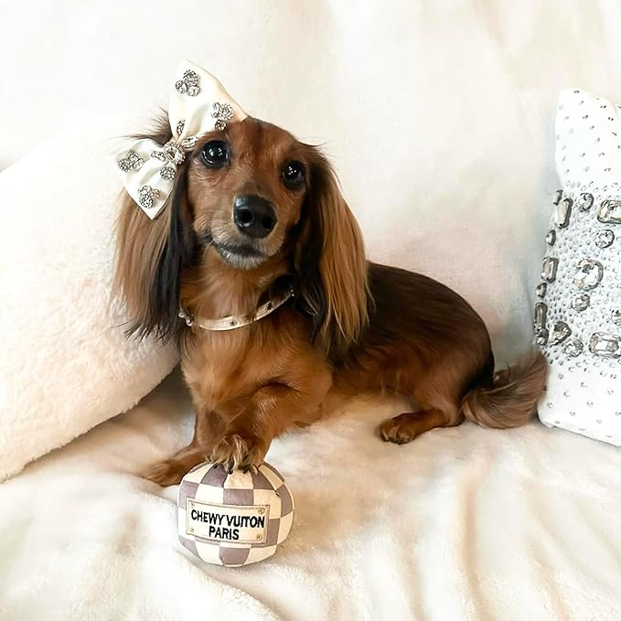 - Funny Parody Plush Dog Toy: Let your furry fashionista fetch some fashion-forward fun with this Checker Chewy Vuiton Ball that features a stylish taupe and cream checker pattern. It’s a playful, cute interactive dog toy that combines style & fun. Size Small 3.5".