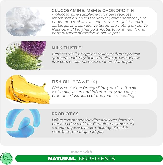 - Veterinarian Formulated - Our supplements are veterinarian formulated and are free from harmful ingredients like Palm Oil, Corn, Soy Derivatives, Synthetic Colors, or Artificial Flavors, prioritizing your pet's well-being.