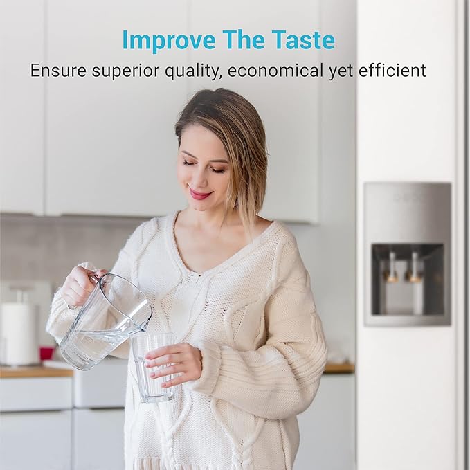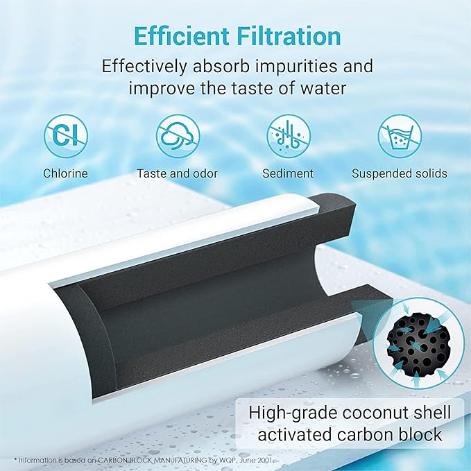 - High-quality filter material: AQUA CREST brings you an upgrade with a 100% selected coconut shell carbon block. The surface area is larger. There are also more micropores to increase the filtration process’s efficiency, giving no chance to impurities like bad taste and odor, sediments, chlorine, and heavy metals.