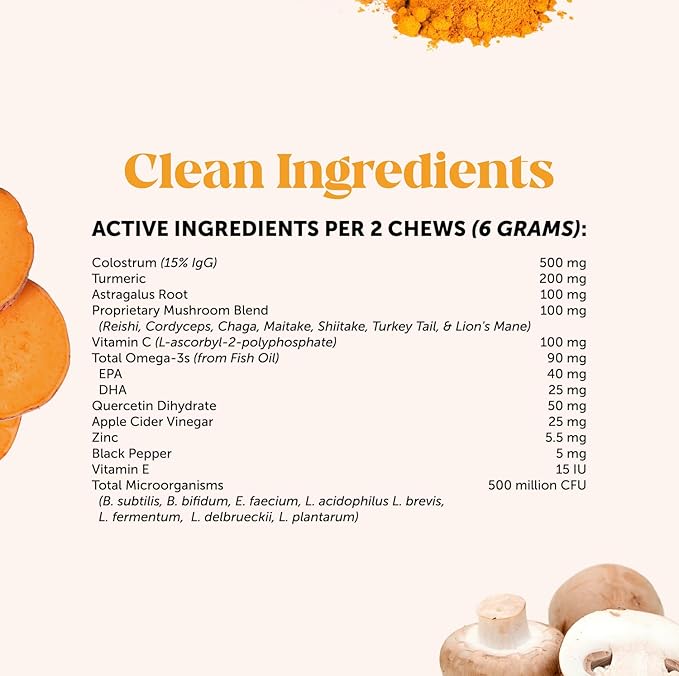 - FROM THE INSIDE OUT: Our dog Omega-3 supplements are made with powerful vitamins & natural ingredients like dog salmon oil, bovine colostrum for dogs, prebiotics & dog probiotics for allergies & itching. But the ingredients in our allergy dog chews don’t just relieve irritated skin. They help dogs that experience watery eyes, sneezing, & paw licking too, so they can live their happiest, & healthiest lives.