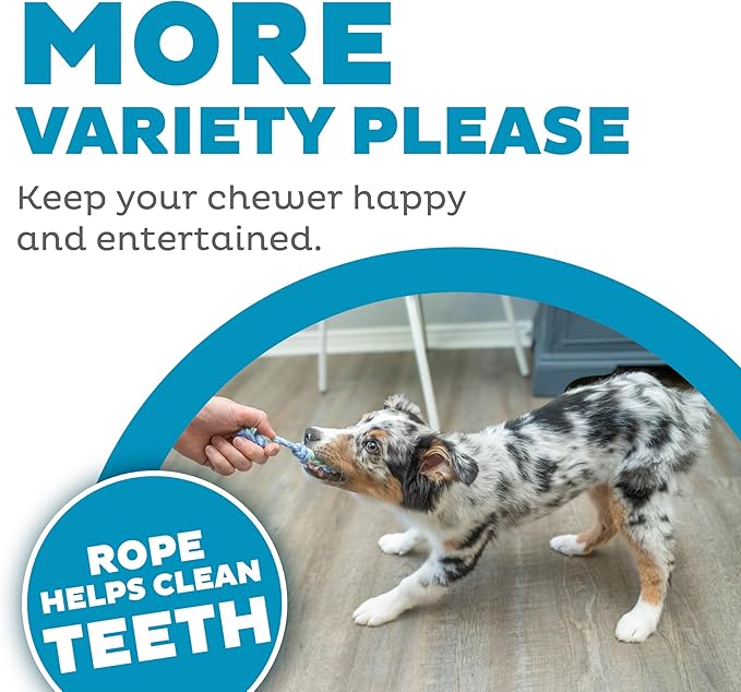- Variety of textures including rope help clean teeth, massage gums, and keep things interesting