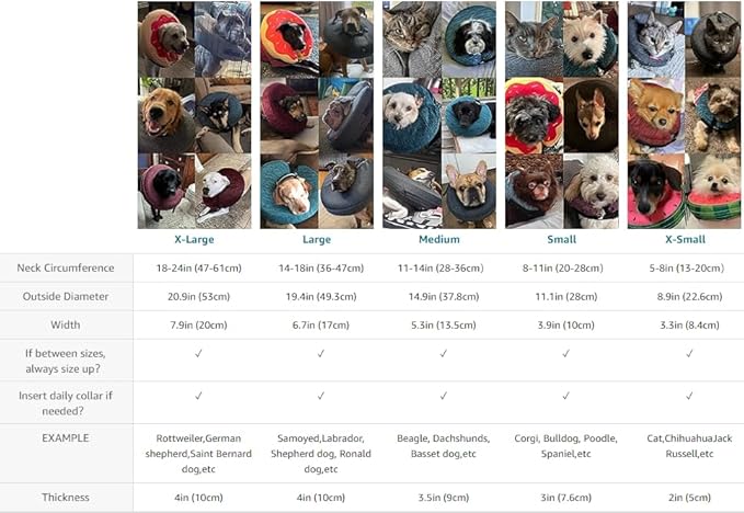 - MULTIPLE SIZES FOR PERFECT FIT: Available in X-Small to X-Large to suit all dog breeds. Measure your dog's neck circumference carefully. WARM PROMPT - Due to differences in dog breeds, body sizes, and growing environments, this comfortable dog cone may not be suitable for dogs with long noses, long legs, long tails, and long bodies