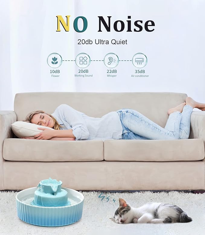 - EXTREMELY QUIET: The water bowl fountain is very quiet, the latest generation of the pump uses a unique motor technology, super quiet (less than 40 decibels).