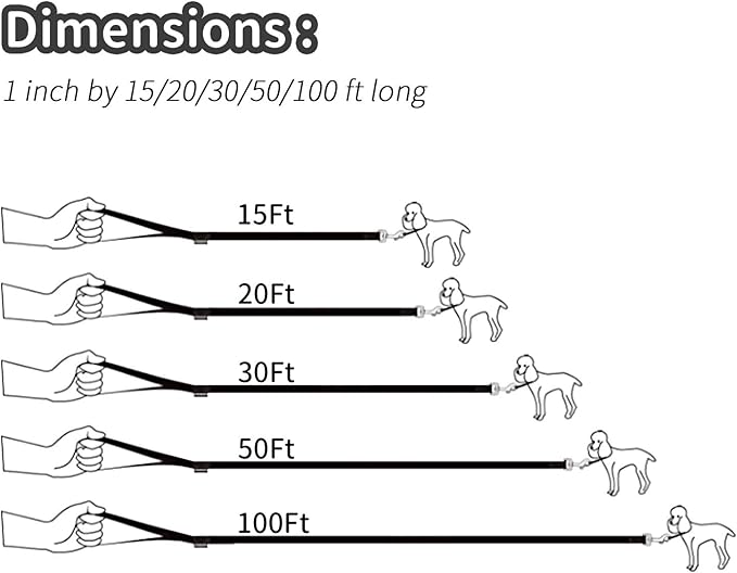 - Dimensions - This dog leash measures 1 inch wide by 100ft long. Great for hiking, camping, training, hunting, backyard, beach, recall training, outdoor play with tennis balls, and swimming!