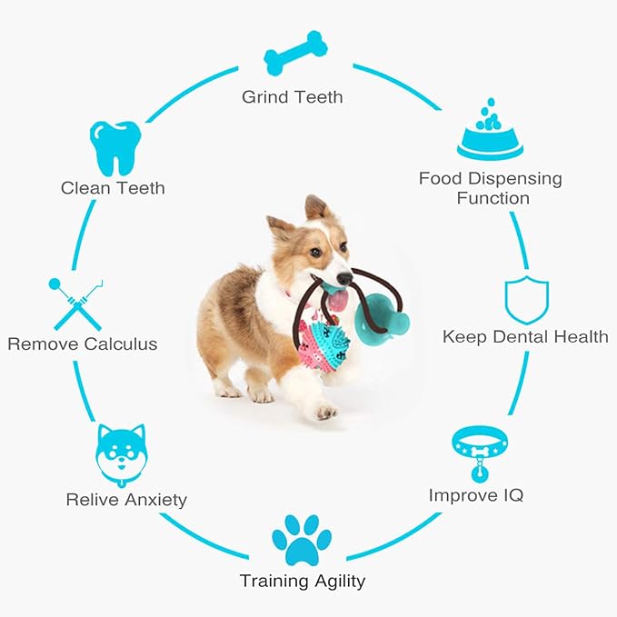 - It is a suction cup dog toy for aggressive chewers with functions of cleaning teeth, grinding teeth, removing calculus, keeping dental health, reliving anxiety, training agility, improving IQ, interactive tug of war, killing boring time and automatic food distribution.
