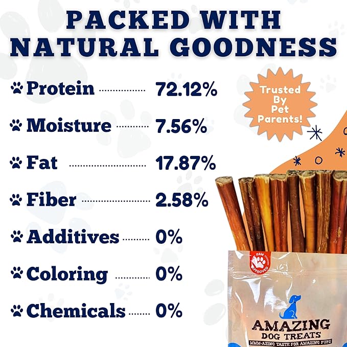 - HIGH IN PROTEIN: Bully Sticks are high in protein, and low in fat content. Amazing Dog Treats offers multiple different size bully stick alternatives for you and your pup. Thinner sticks for the more sensitive chewers, and thicker sticks for the larger breeds. We even have bully stick bubble bites for those looking for a short-term reward chew.