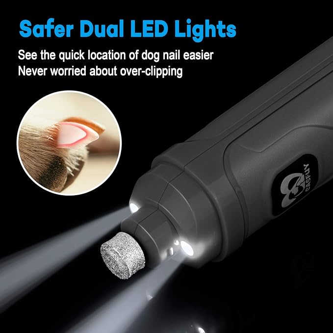 - Upgraded Dog Nail Trimmer with 2 LED Lights: Casfuy electric dog nail trimmer has 2 LED lights that allows you to see the location of dog’s quick easier. Avoiding over-grinding, causing less hurt to your furry friends. Dual LED lights is a new design, lights shine more accurately than other ordinary LED grinder.