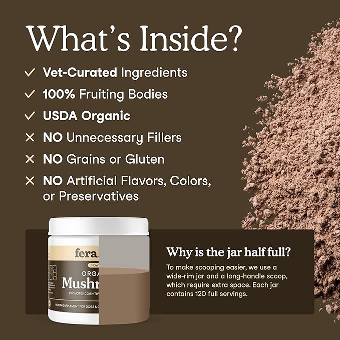 Fera Pets Mushroom Supplement for Dogs & Cats with Turkey Tail - USDA Organic - Cognitive and Immune Support - Enhances Liver Function - Supports a Healthy Gut - Powder - 120 Scoops