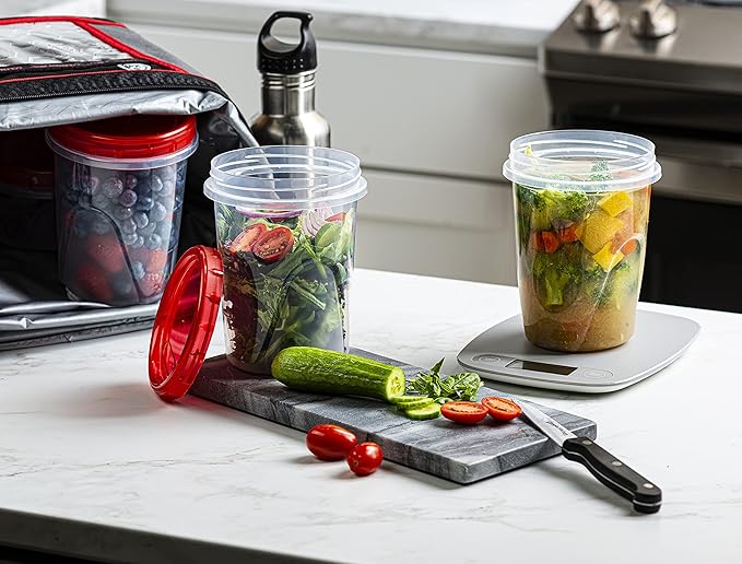 - 32 oz 10 Pack Twist Top Containers Clear bottom With Red Top Twist on Lids Reusable, Stackable, Food Storage Freezer Container