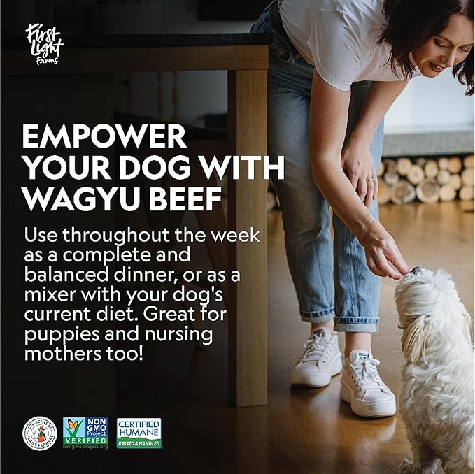 - Premium Wagyu Beef as the Star Ingredient: Treat your dog to the rich, delicious flavor of First Light Farms Wagyu beef dog food. Our high-quality formula features Wagyu beef as the primary ingredient, ensuring a protein-packed meal that supports strong muscles and overall health.