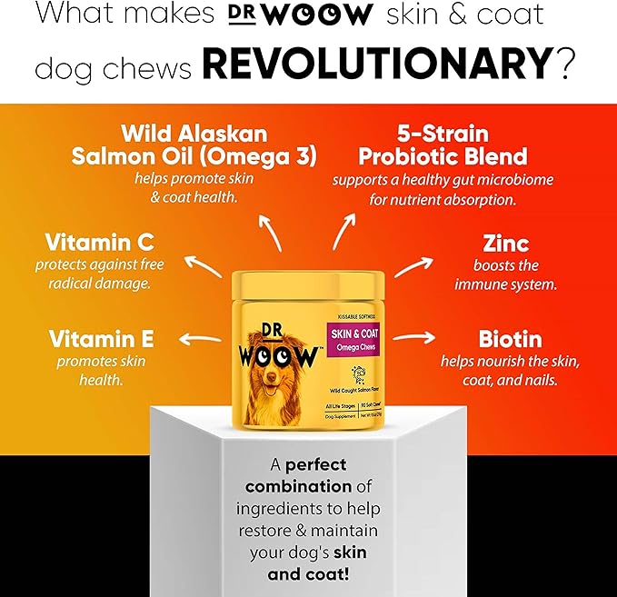 - BIOTIN, ZINC, VITAMIN C AND VITAMIN E: Help restore your dog's skin and coat with these fish oil for dogs chews with omega 3 for dogs fatty acid that may help promote skin and coat health, as well as Biotin that may help nourish skin, coat, nails