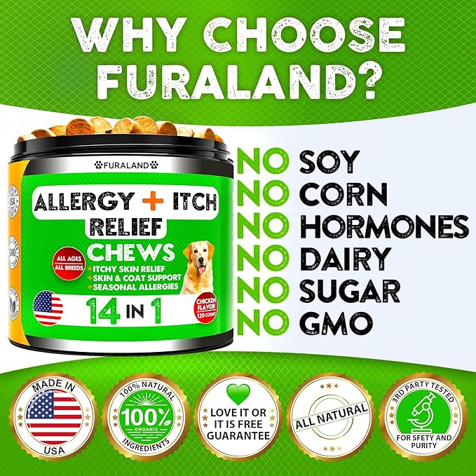 - Allergy Relief - prevent environmental pollutants, seasonal and food allergies, ease symptoms like paw licking, itching, chewing & scratching, irritation, bald spots, rashes and hot spots