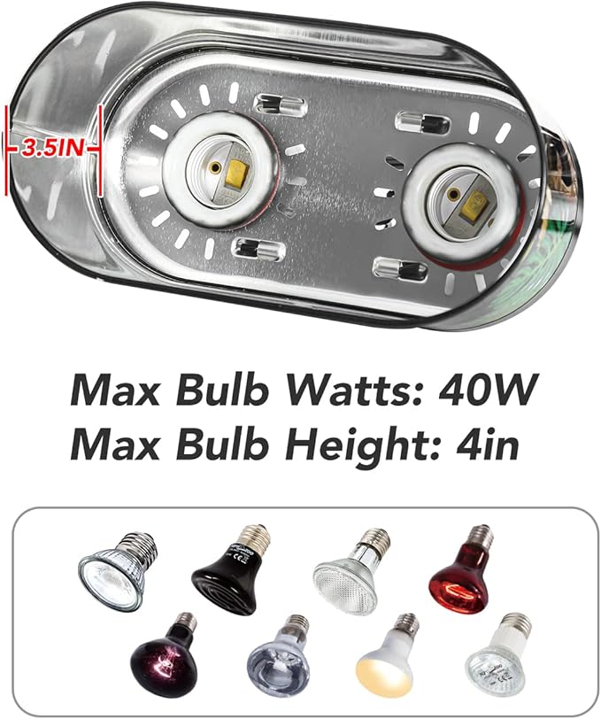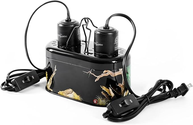- Unique Print Dual Lamp Fixture Design: Max Bulb Watts: 40W, Max Bulb Height: 4 inch.The print design suit for both desert and tropical reptiles , it make your pet living environment look more beautiful.Integrated dual lamp fixture Design can meets your pet's demands for the light.Make the living environment more tidy.(suit for :Reptile ceramic heat lamp, UVB UVA basking spot lamp,UVB lamp,daylight lamp,and nightlight lamp,Infrared Spot Lamp and so on).