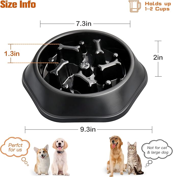 - Slow Eating and Anti-Chocking: It can hold 1-2 cups of dog food, also depending on the size of the dog food. This slow feeder bowl can effectively slow down their eating speed to prevent choking, obesity and indigestion. Guiding your pets to form a slow eating diet.
