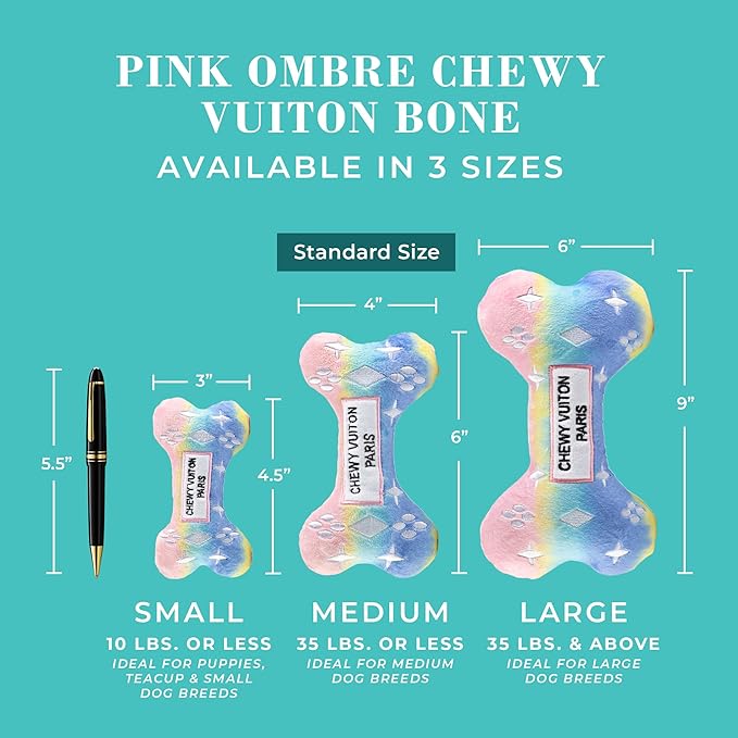 - Funny Parody Plush Dog Toy: Let your furry fashionista fetch some fashion-forward fun with this Pink Ombre Chewy Vuiton Bone that features a stylish pink ombre color with a white monogram pattern on the plush exterior and a built-in squeaker hidden inside. It’s a playful, cute interactive dog toy that combines style & fun. Size Small 4.5"x5"x3".