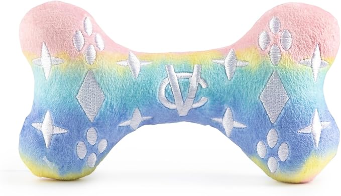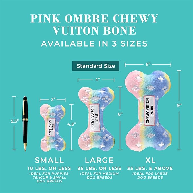 - Funny Parody Plush Dog Toy: Let your furry fashionista fetch some fashion-forward fun with this Pink Ombre Chewy Vuiton Bone that features a stylish pink ombre color with a white monogram pattern on the plush exterior and a built-in squeaker hidden inside. It’s a playful, cute interactive dog toy that combines style & fun. Size Large 6"x4"x1".