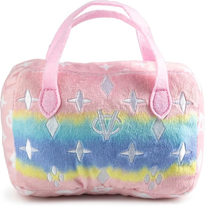 - Funny Parody Plush Dog Toy: Let your furry fashionista fetch or strut some fashion-forward fun with this Pink Ombre Chewy Vuiton Handbag in a stylish pink ombre color with a white monogram pattern on the plush exterior and a built-in squeaker hidden inside. It’s a playful, cute interactive dog toy that combines style & fun. Size Large 6"x5.5”x4”.