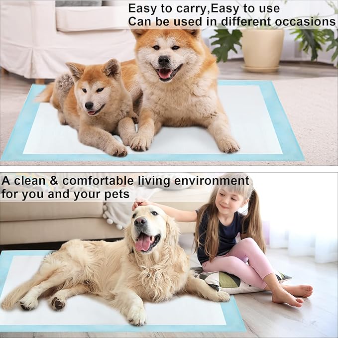- Leak-Proof Disposable Dog Training Mat: Each pee pads for dogs uses PE film on the back, an absorbent pad in the middle, and plastic borders on all sides to prevent spills. Dog training mats are easy to pick up and won't leak or splash on wood floors, keeping your room clean all day long