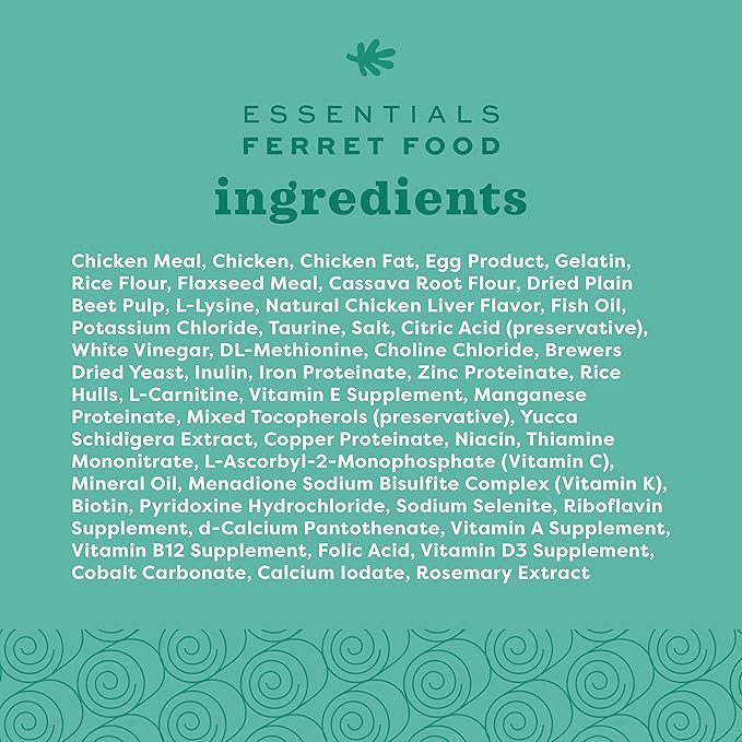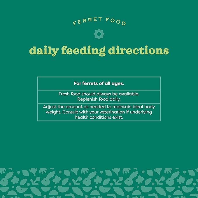 - MAINTAIN THEIR DIET: Featuring animal-based proteins and fats as the top 5 ingredients, this ferret food supports muscle maintenance and optimal body condition; expertly crafted to meet the nutritional needs of ferrets for daily health and happiness