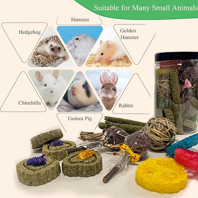- GREAT GIFT FOR SMALL PET - Suitable for bunnies, guinea pigs, chinchillas, squirrels, rabbits, hamsters, gerbils, holland lops, prairie dogs, squirrels, and other rodent species. Kindly Note: If your small pet has had almost no interest in them at first, you can put these chew toys in a cage and let them adjust for a while, they will slowly try to chew them and gradually be ecstatic.