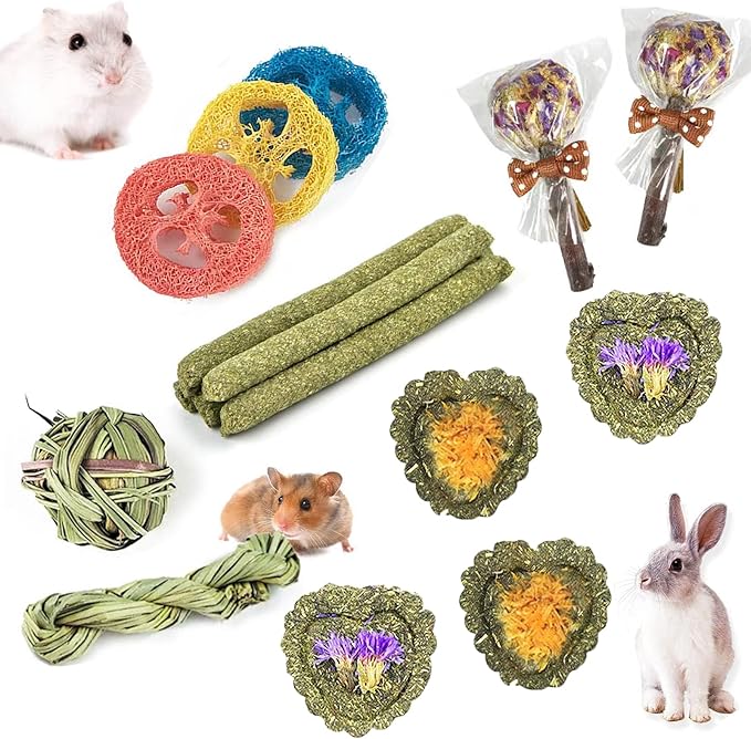 - 16 PCS GREAT DEAL OF VALUE - Provides hours of fun and healthy growth for your adorable pet. The packing list has 2pcs aquatic grass toys, 3pcs loofah toys, 2pcs three color lollipops, 5pcs timothy's hay stick, 4pcs timothy's hay cake.