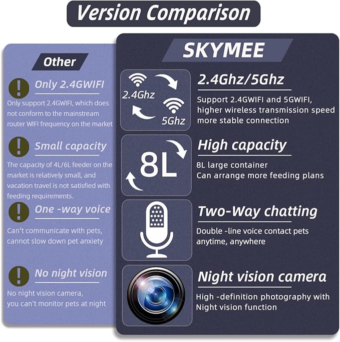 - MORE -- Skymee will alert you when it detects dog movements or food running low. Dual power supply system with external USB cable and 3 pieces D batteries (not included) to prevent power off. Please pay attention that skymee pet feeder can connect 2.4G WiFi and 5G WiFi.