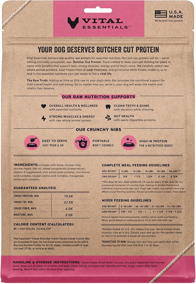 - CRUNCHY FREEZE-DRIED RAW CHICKEN DOG FOOD: Vital Essentials Crunchy Freeze Dried Dog Food packs more protein than industry standard into every bite to deliver the peak vitality your dog deserves, especially when compared to dehydrated dog food. This complete and balanced freeze-dried raw dog food is made with premium butcher cut chicken, responsibly sourced in the USA.
