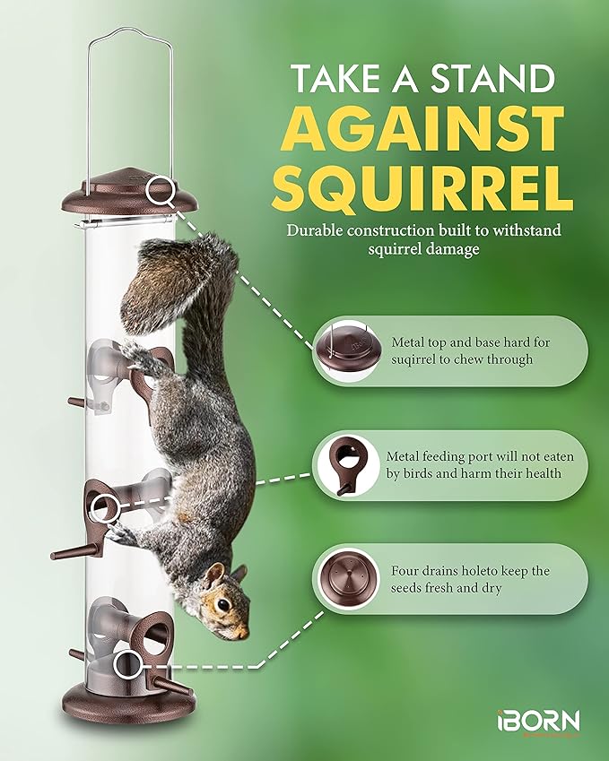 - 【Metal Bird Feeder】Metal top & base, aluminium feeding ports survived from Squirrel Damaging. Durable quality to sustain wear and worn outdoors. We adopt advanced technique for metal finishing to help the metal last longer when used outdoors.