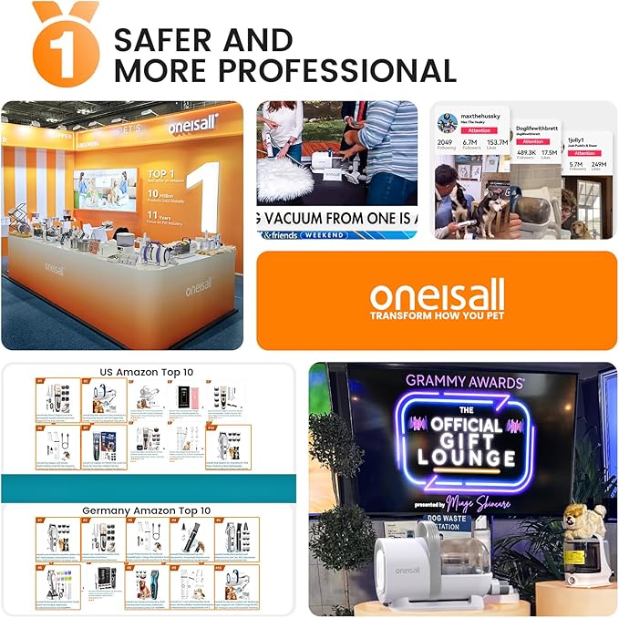 - 7 in 1 Pro Pet Grooming Kit,Keep the House Tidy: oneisall pet grooming kit with vacuum make home grooming easy.The grooming brush and the deshedding tool gently remove loose hair and making pet hair shiny and smooth while eliminating tangles. Electric clipper, dog paw trimmer and dog nail grinder provides excellent cutting. Give your pet a best grooming experience. Nozzle head and Cleaning brush can be used for collecting pet hair falling on the carpet, sofa and floor