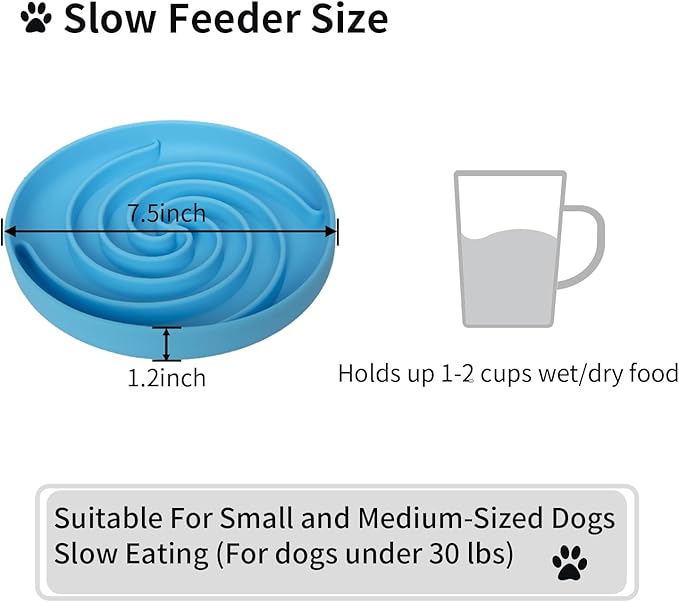 - The Ideal Size: All dogs will love this interactive 7.5-inch x 1.2-inch silicone slow-feeding dog bowl, which can store up to 1-2 cups of dry, wet, or fresh food