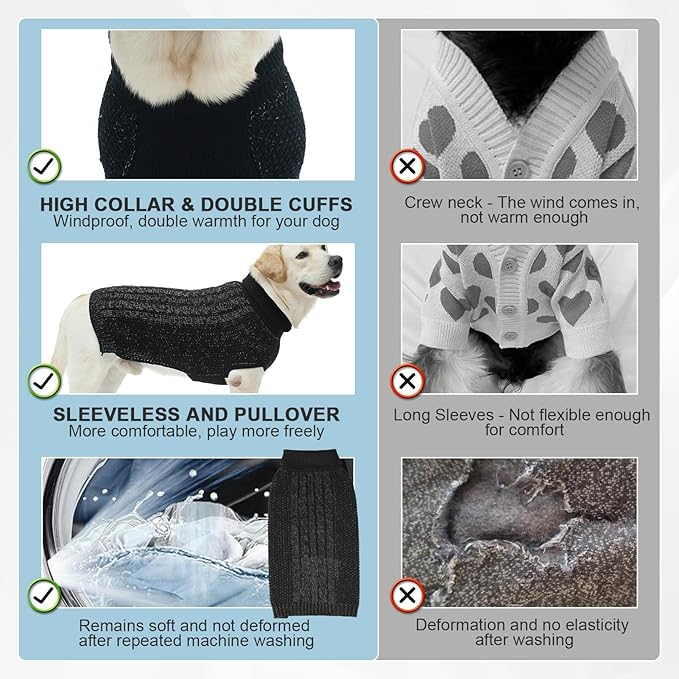 - WARM & COZY TURTLENECK SWEATER DESIGN: This warm dog knit fabric is designed for harsh autumn and winter weather and is made of soft and warm high-density acrylic yarn. This dog turtleneck sweater features a foldable collar, providing comprehensive coverage in cold weather to keep your big dog warm. The sweater has good elasticity and a sleeveless design that is easy to put on and take off, making it very suitable for large dogs.