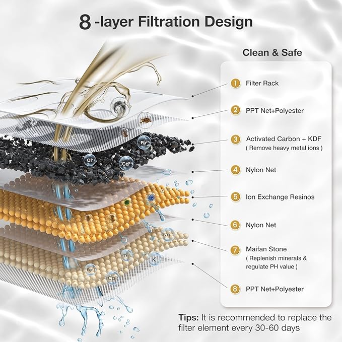 - Efficient 8-Layer Filtration: Our pet water fountain uses advanced filtration with activated carbon, ion exchange resin, mineral ceramic balls, and unique KDF materials. This efficiently removes impurities, softens water, and eliminates odors. The app shows the filter cartridge lifespan