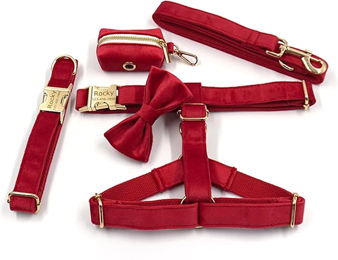 Personalized Velvet Dog Collars with Pet Name Phone Number Engraved, Custom Adjustable Soft Collar with Metal Buckle for Small Medium Large Dogs, Dog Leash and Bow Tie Available -Red