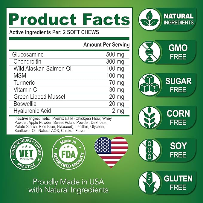 - Premium Natural Ingredients Give Results: No Added Sugar, Wheat, Corn, Gmo or Preservatives. We are committed to using only best ingredients that deliver results in our dog glucosamine chews