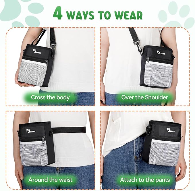 - 【Multiple Ways to Wear】The dog walking bag comes with a portable shoulder strap, waist belt and waist clip, you can wear the training bag as a crossbody bag, shoulder bag or fanny pack to find your own comfortable way to wear the pet training treat bag.