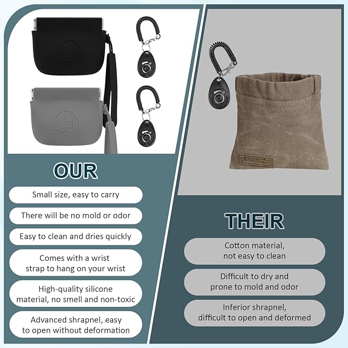 WALLFID Silicone Dog Treat Pouch Small Bag,Auto Closure,with Pet Training Clicker,Walking Bag for Dog and Cat,Pocket Size,Easy to Clean,Odorless (Dark Gray and Black)