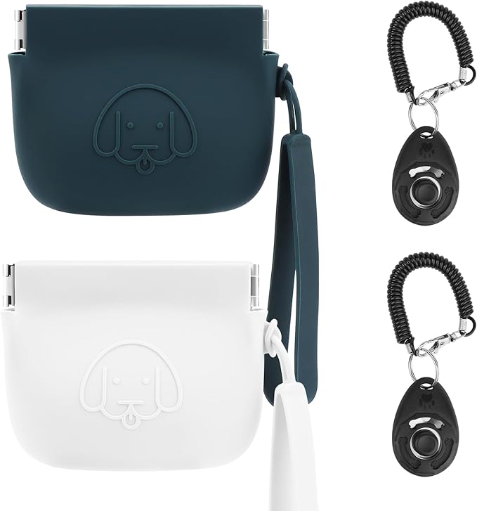 WALLFID Silicone Dog Treat Pouch Small Bag,Auto Closure,with Pet Training Clicker,Walking Bag for Dog and Cat,Pocket Size,Easy to Clean,Odorless (Green and White)