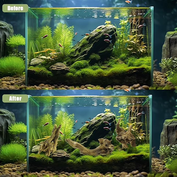 - SAFE AND ROBUST -- Our high-quality aquarium driftwood can regulate the pH value and gH value of the fish tank freshwater, with features such as water softening and stable water quality. Driftwood branch is sturdy and durable, and it may have moss when placed in water for a long time, but they will become a delicious source of nutrition for fish, shrimp, turtles and other aquatic animals.