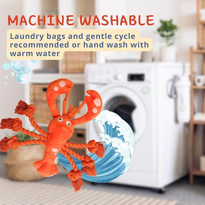 - đ¶ăSqueaky Dog Toys with Fun Soundsă This Ocean Theme lobster dog plush is both cute and engaging, featuring a built-in squeaker in its head and crinkle paper in its claws that add excitement to playtime and keep dogs busy and happily entertained.