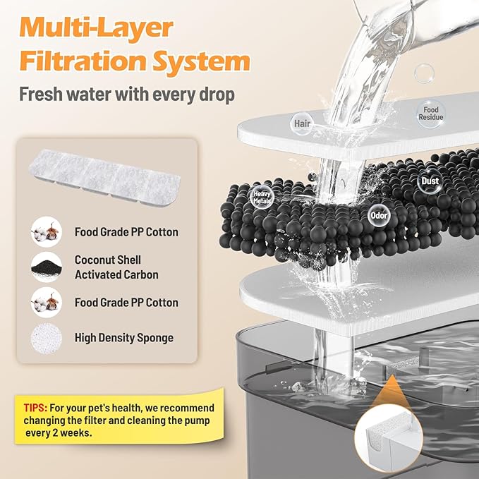 - [Keep Water Clean and Fresh] SIBAYS large pet water fountain combines PP cotton, coconut shell activated carbon filter and high-density sponge, efficiently removing hair, food residue, dust, odor, heavy metals from the water, while maintaining water quality and boosting oxygen levels. This ensures your pets drink clean and fresh. Clean water keeps your dog's kidneys healthy.