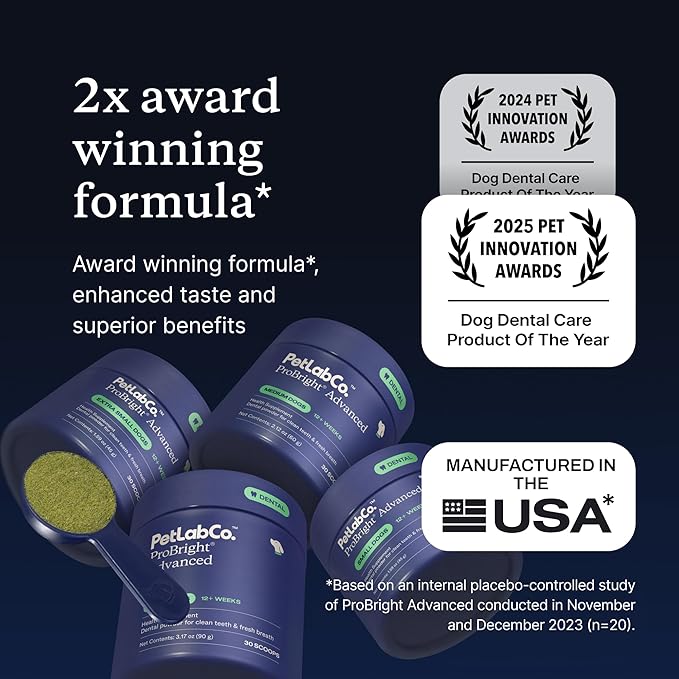 - Award-Winning, Clinically Tested* Formula - ProBright Advanced is the dog dental care product of the year—now with a new flavor, superior ingredients, and a clinically tested formula. In just 28 days, daily use was shown to significantly reduce bad breath–causing compounds. Say goodbye to toothpaste, brushing battles, and dental sticks. Say hello to ProBright—advanced, effortless oral care at its best