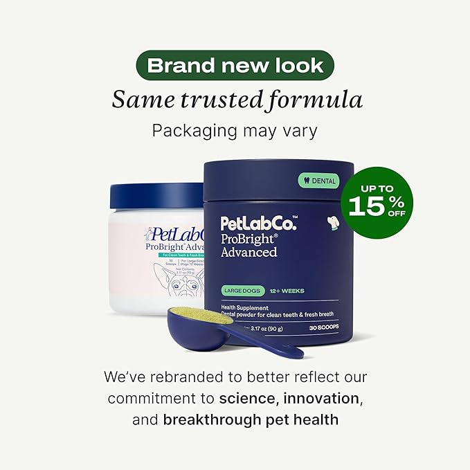 PetLab Co. ProBright Advanced Dental Powder - Dog Breath Freshener - Teeth Cleaning Made Easy – Targets Tartar & Bad Breath - Packaging May Vary - Formulated for Large Dogs