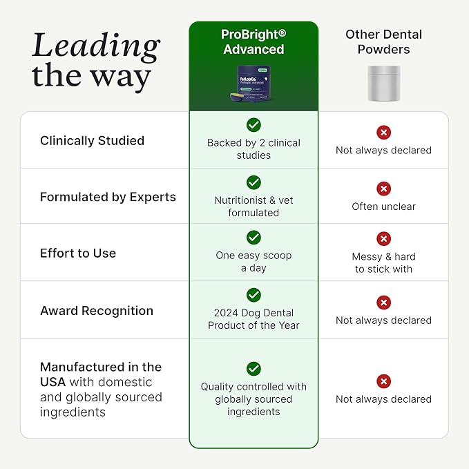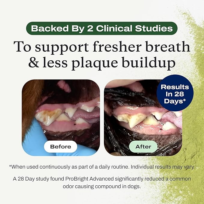 - Award-Winning, Clinically Tested* Formula - ProBright Advanced is the dog dental care product of the year—now with a new flavor, superior ingredients, and a clinically tested formula. In just 28 days, daily use was shown to significantly reduce bad breath–causing compounds. Say goodbye to toothpaste, brushing battles, and dental sticks. Say hello to ProBright—advanced, effortless oral care at its best