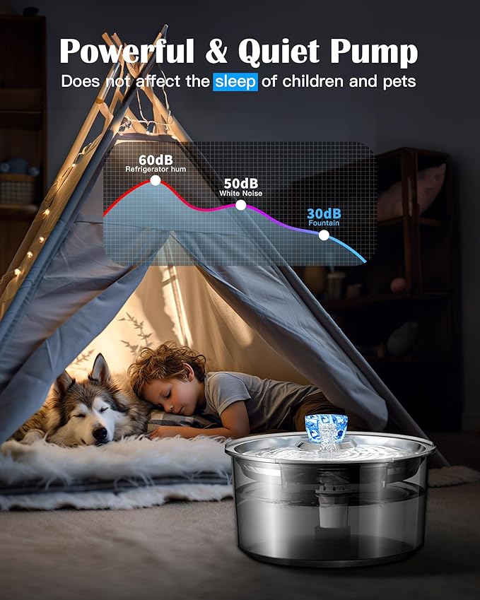 - LED Low-Water Shut Off – Built-in LED indicator turns red when water is low, and the submersible stainless steel pet fountain pump automatically stops to prevent dry running, helping extend the motor’s lifespan.