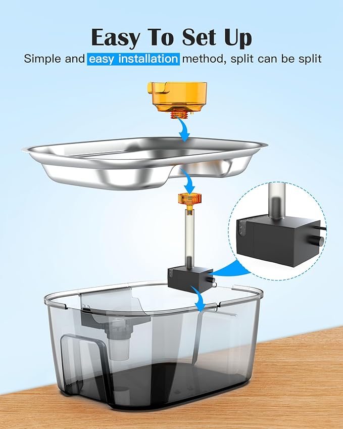 - Easy to Clean & Maintain – Includes a 6.6 ft (2 m) power cord for easy placement. The pet water bowl dispenser pump can be disassembled without tools for quick cleaning. Built-in filter sponge traps pet hair and debris to keep water clean.