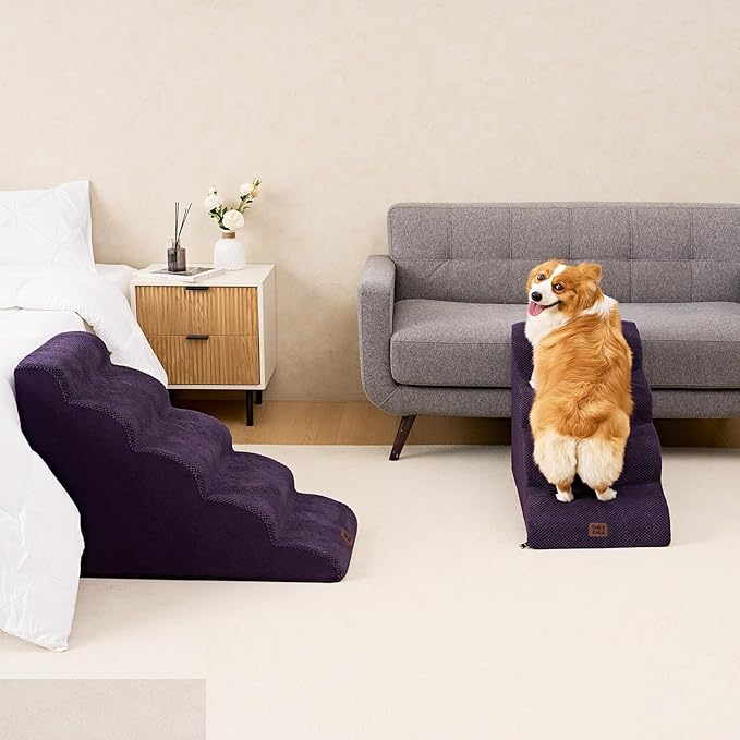 - SPECIFIC AND STEADY DESIGN - 33D density of pure foam make this stair more steady when your pets walk on. The dog bed stairs can provide strong support for pets in the walking process. Low angle slope design can better protect your pet's joints.