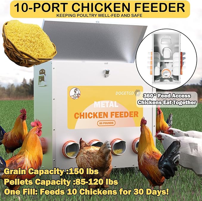 Automatic Chicken Feeder No Waste Metal Poultry Feeder Large Capacity 85lbs for Chickens, Geese, Ducks, Turkeys, Quails (10-Port)